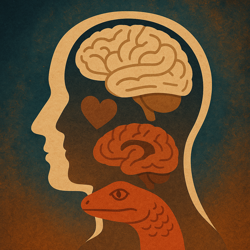 - Il cervello rettiliano (o “R-complex”) — si attivi per funzioni istintive, sopravvivenza e comportamenti “primitivi”. Arriva senza pensare ed è il più veloce a prendere voce nella nostra testa, ma totalmente irrazionale ed egoista.